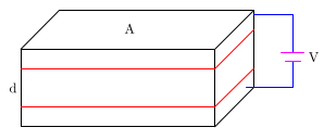 Yüzey alanı A olan dikdörtgen prizma biçiminde iletken bir levha düşünelim: Şekil 2-1. Bu levhadan bir tane daha alalım ve d kalınlıklı A alanlı dikdörtgen prizma şeklindeki yalıtkan bir ortamla bu özdeş iki levhayı birbirinden ayıralım, yalıtalım. Yalıtkan ortam Şekil 2- deki iki kırmızı çizgi arasında kalan bölümdür. İletken kısımlara V potansiyel farkı uygulayalım. Artık bir kondansatörümüz (kapasitörümüz) var.